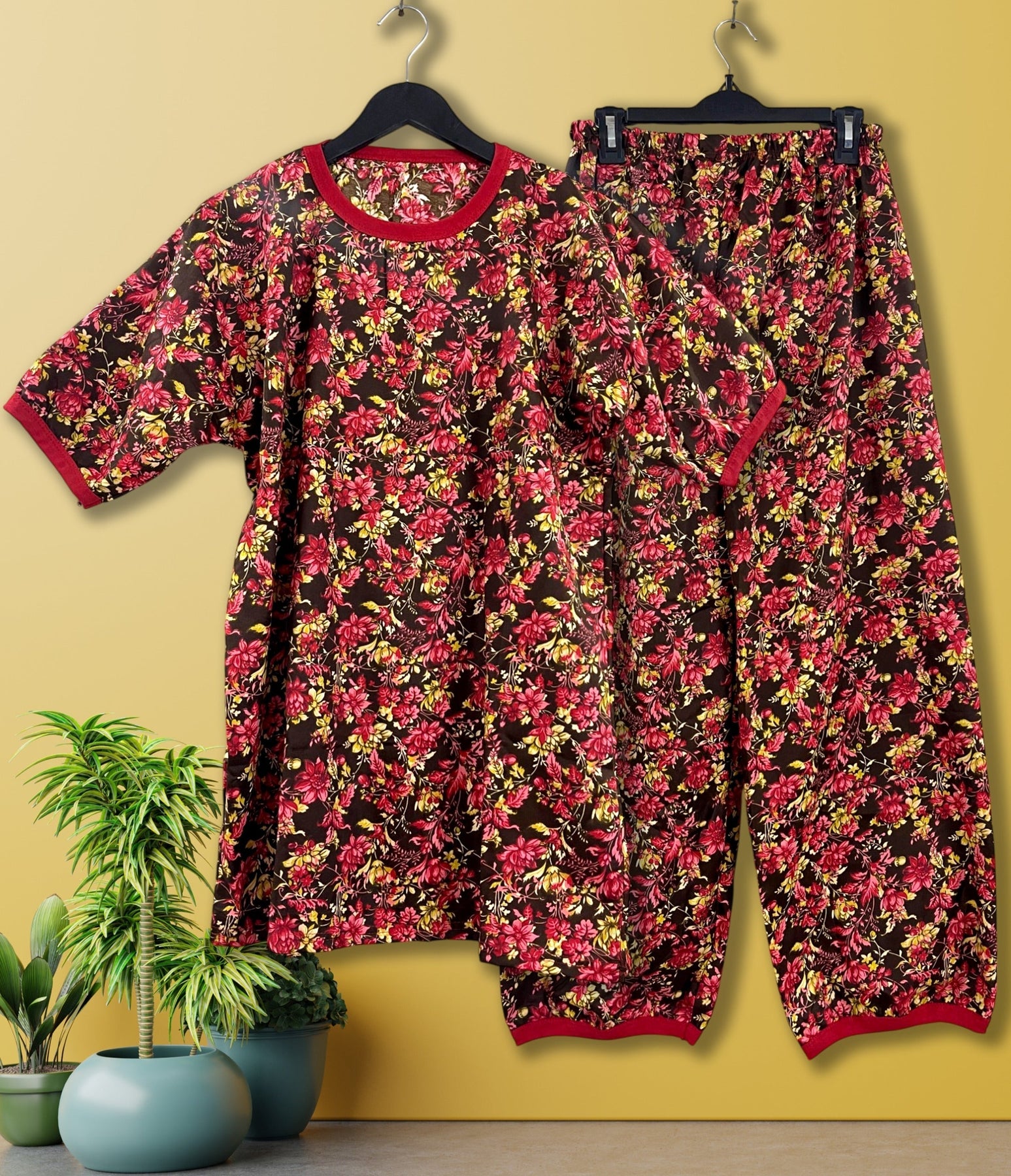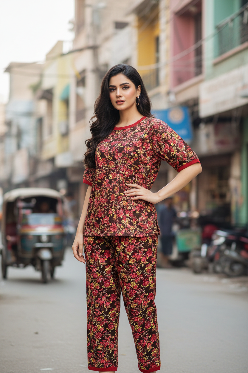 Inspired by deep saffron tones and classic floral prints, this nightwear set is perfect for women who want luxury comfort at an affordable price.