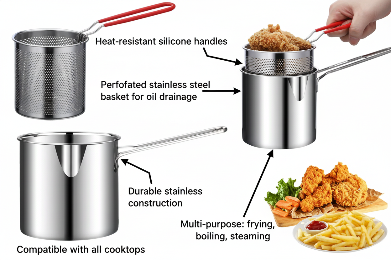 Made from premium food-grade stainless steel, this oil fryer heats evenly, lasts long, and keeps your cooking safe and hygienic. The removable perforated strainer basket makes draining oil easy, so your food comes out crunchy, not greasy.