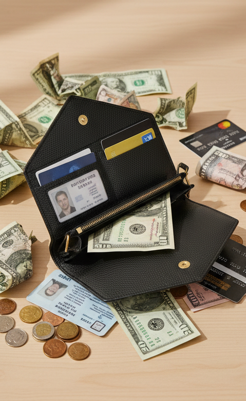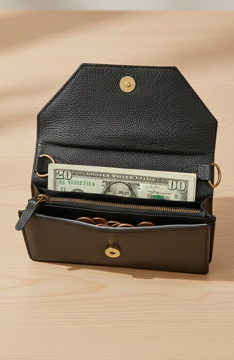 Dedicated sections for cash, cards, and a secure zip pocket for coins or valuables.