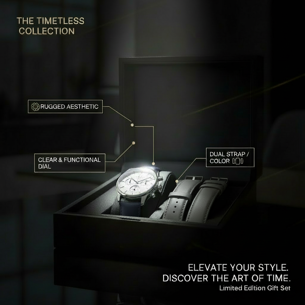 🪢 Dual Strap/Color: Features a strap or set of straps that incorporate the navy blue and gray color scheme (e.g., a gray watch head with a navy blue strap, or a set with two interchangeable straps), maximizing styling options for both casual and formal wear. (Keywords: Dual Strap Watch, Navy Gray Watch, GearLine Watch, Men's Versatile Watch, Executive Blue Watch)